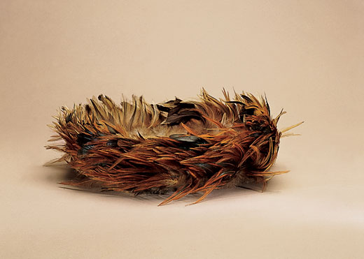1 / 6 A warrior's headdress of prized red-orange rooster feathers is thought to have been worn either in combat or for ritual dances; it was collected in 1886 by the USS Mohican expedition. James Di Lorento, SI