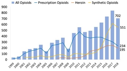 Figure 1. Number of overdose deaths involving opioids in West Virginia, by opioid category. Drug categories presented are not mutually exclusive, and deaths may have involved more than one substance. Source: CDC WONDER, 2020.