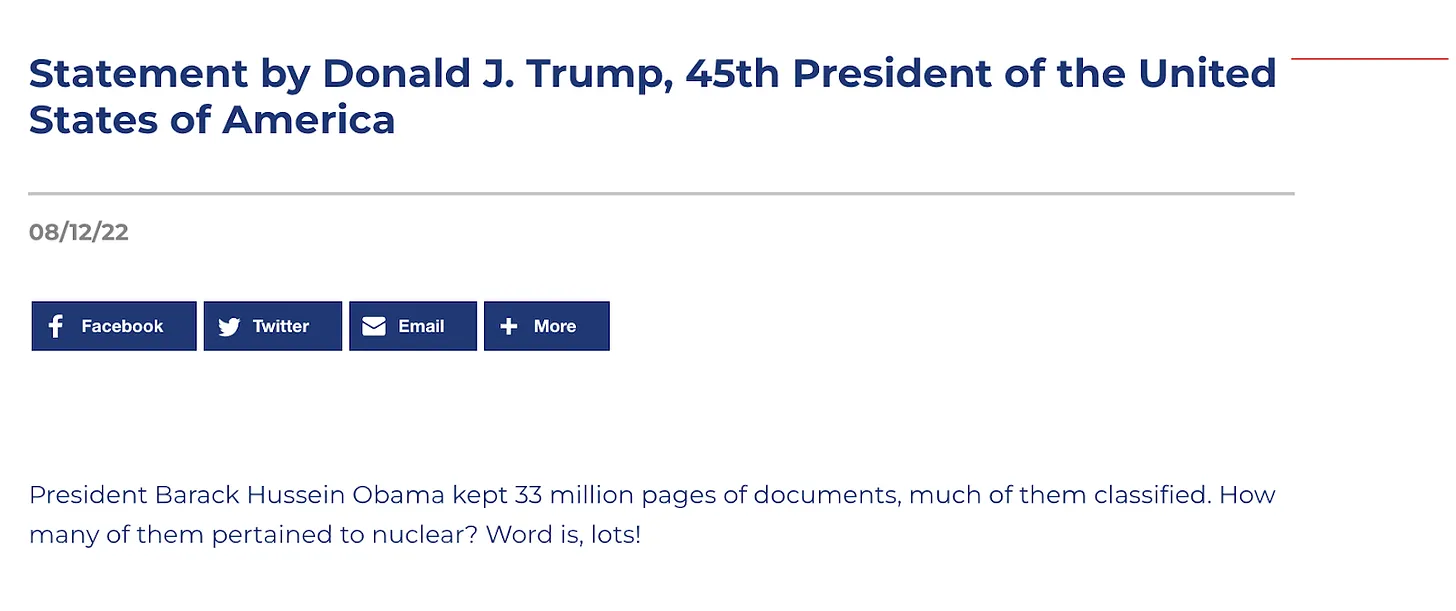 In an attempt to defend himself against reports that he has classified documents in his Florida residence, Donald Trump in a statement on Friday (since deleted from his website) said Barack Obama “kept 33 million pages of documents, much of them classified. How many of them pertained to nuclear? Word is, lots!”