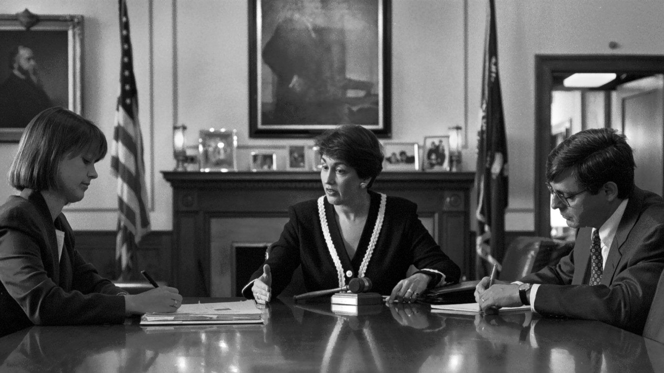 Deputy Attorney General Jamie Gorelick takes a meeting with Amy Jeffries (left), counsel to the DAG, and Merrick Garland (right), principal associate DAG, in her office at the Justice Department, in September 1995. (Bill O’Leary / The Washington Post / Getty)