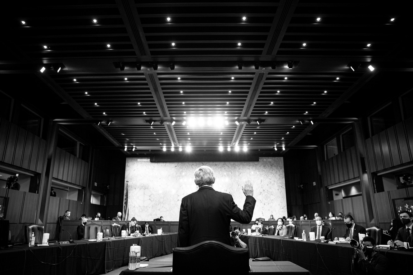 The attorney-general nominee Merrick Garland is sworn in during his confirmation hearing before the Senate Judiciary Committee on Capitol Hill in Washington, D.C., on February 22, 2021. (Al Drago / The New York Times / Redux)