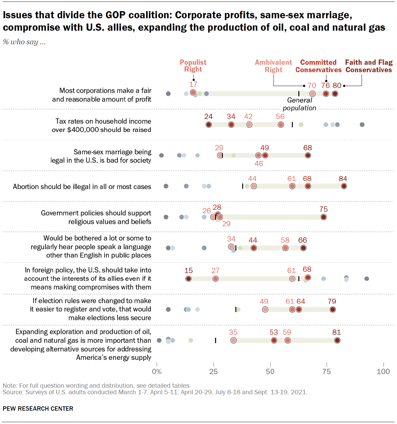 As noted, Populist Right are deeply skeptical of corporations. In fact, just 17% say corporations make a fair and reasonable profit; that compares with 70% or more of the other GOP-aligned groups. In views of U.S. relations with its allies, majorities of Committed Conservatives and Ambivalent Right say the U.S. should heed allied interests even if it means compromising with them. Much smaller shares of Faith and Flag Conservatives and Populist Right express this view.