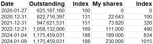 So I thought, lets see how bad it's been for me. We have the outstanding shares, the evolution of devaluation, so let's spice that up with how many shares I had myself at that particular moment in time.