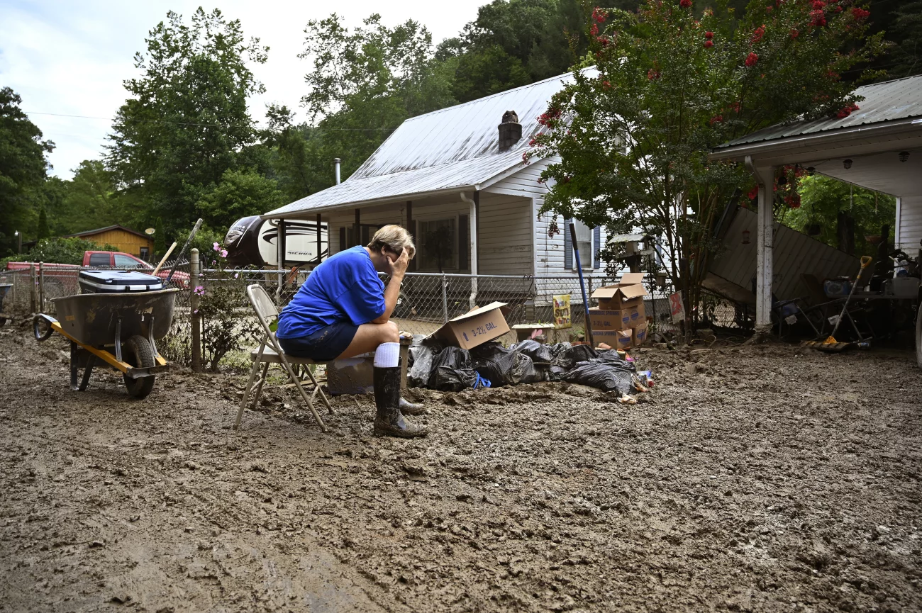 Teresa Reynolds sits exhausted as her neighbors remove debris from their flood-ravaged homes in Hindman, Ky., in July 2022. The deadly floods were caused by torrential rains. Climate change makes such record-breaking rainstorms more common in much of the United States. Timothy D. Easley/AP