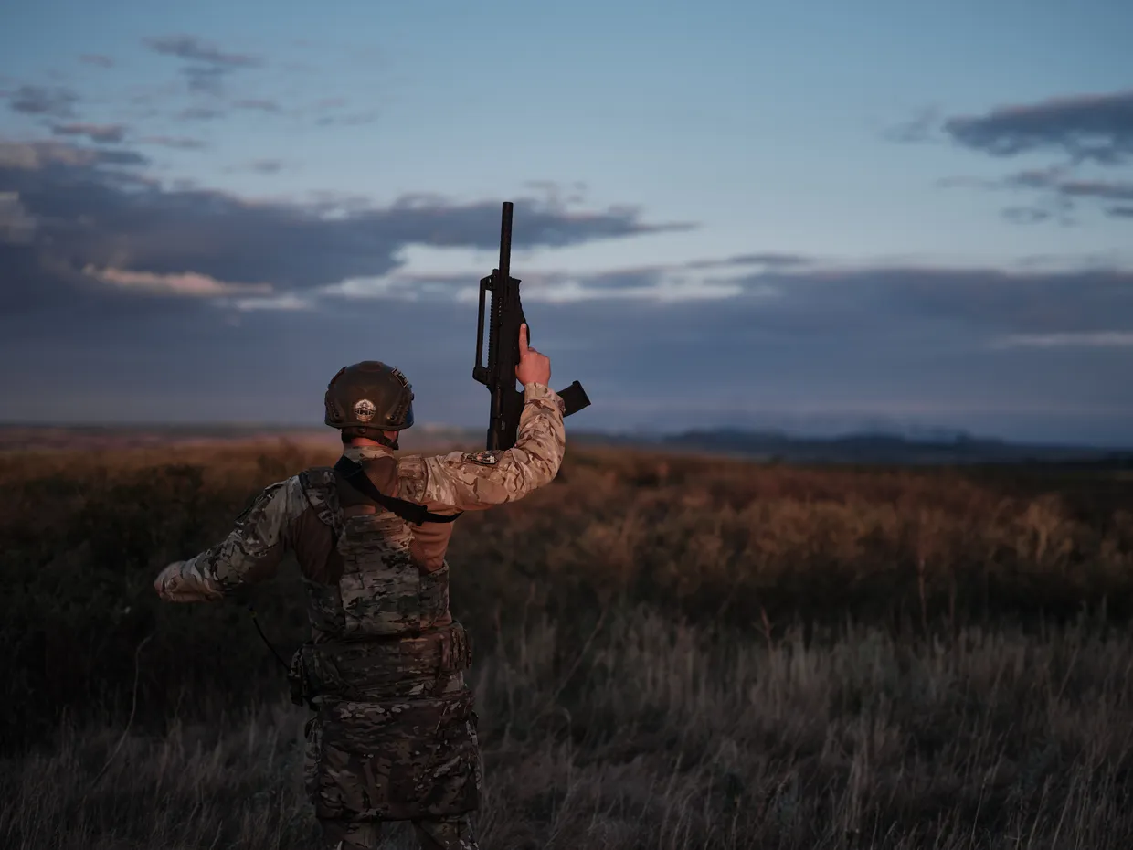 Photo for illustrative purposes. A soldier with a machine gun in his hands looks at the sky and detects enemy drones on July 31, 2024 in Toretsk district, Ukraine. (Kostiantyn Liberov/Libkos/Getty Images)