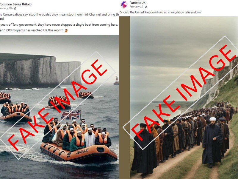 Examples of AI-generated anti-immigration images posted by the pro-Russian far-right Facebook pages. "Fake Image" label added by the ABC.(Supplied: Facebook)