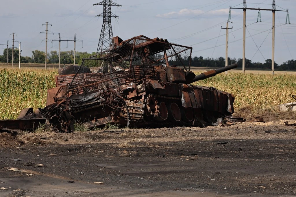 This photograph taken on 16 August, 2024, during a media tour organised by Ukraine, shows a destroyed Russian tank outside Ukrainian-controlled Russian town of Sudzha, Kursk region, amid the Russian invasion in Ukraine. Kyiv said August 16, 2024, its incursion into Russian territory had advanced, claiming it aimed to force Russia to negotiate on "fair" terms, as Moscow's troops announced new gains in eastern Ukraine. (Photo by Yan DOBRONOSOV / AFP)