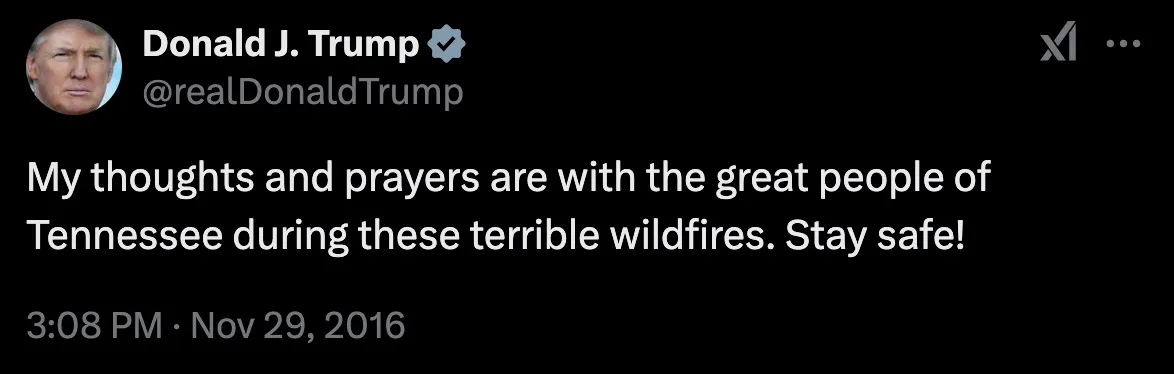 “My thoughts and prayers are with the great people of Tennessee during these terrible wildfires. Stay safe!”