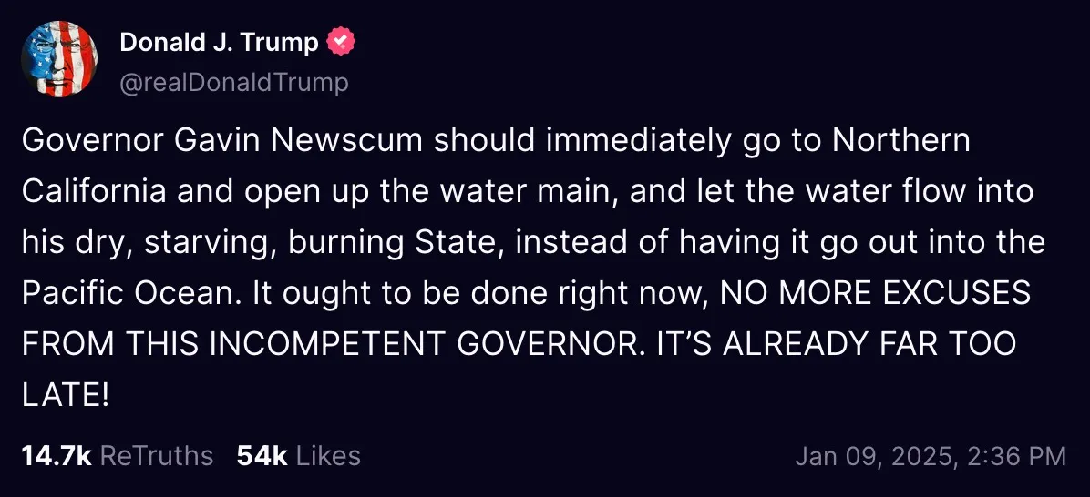 “Governor Gavin Newscum should immediately go to Northern California and open up the water main, and let the water flow into his dry, starving, burning State, instead of having it go out into the Pacific Ocean. It ought to be done right now, NO MORE EXCUSES FROM THIS INCOMPETENT GOVERNOR. IT’S ALREADY FAR TOO LATE!”