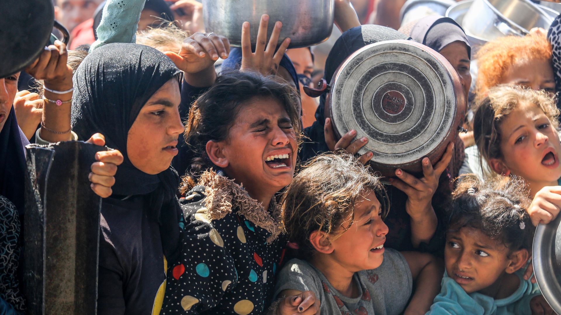 Displaced Palestinian children line up for food in Gaza. Photo: Abed Rahim Khatib/Anadolu via Getty Images