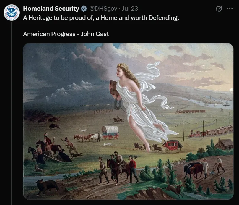 Trump’s administration is certainly fond of the symbolism of building a new America. Trump’s Department of Homeland Security recently posted the famous 1872 painting American Progress, depicting pioneers going to settle the West: