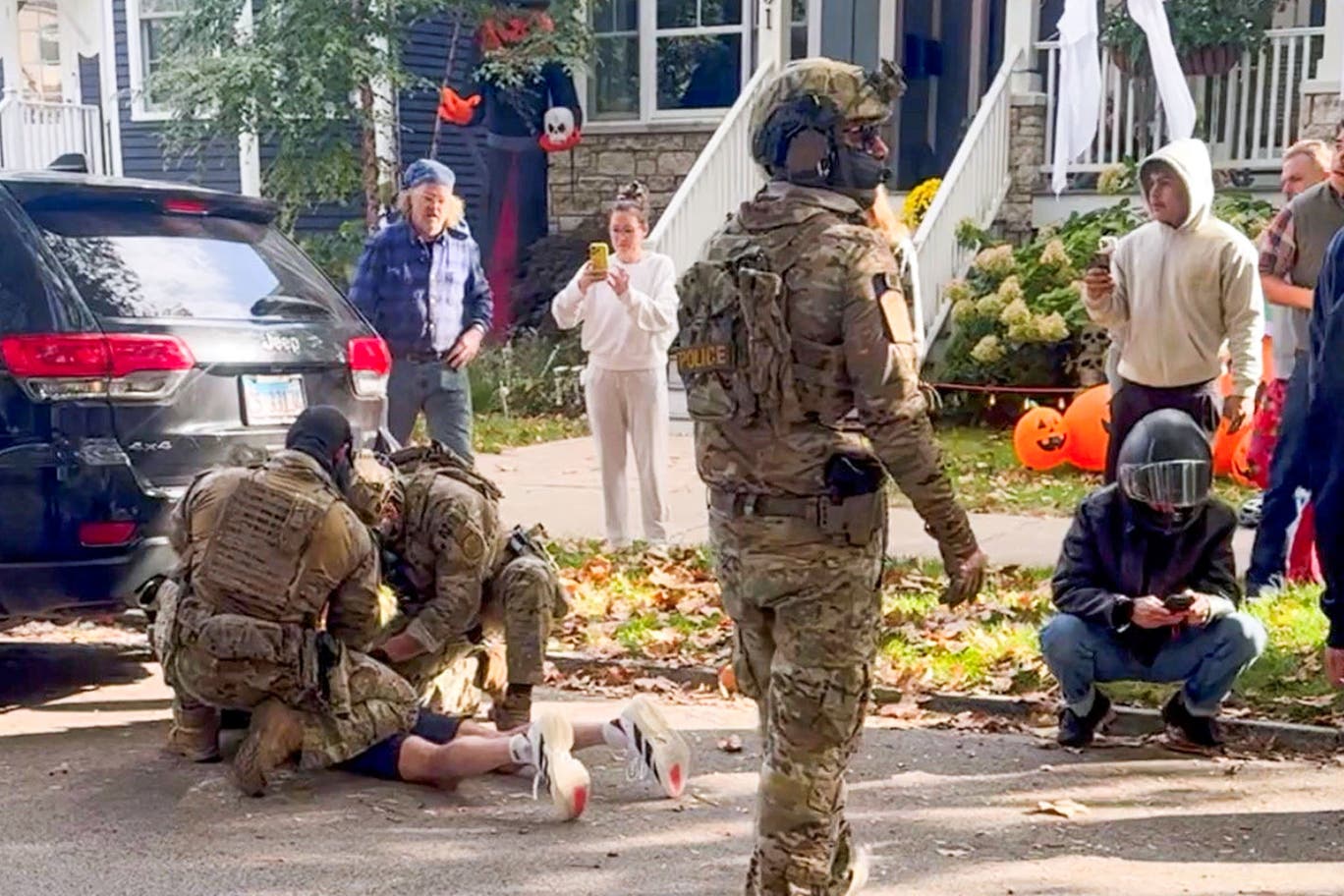 Shocking video shows a chaotic scene on a quiet Chicago street as Border Patrol agents in tactical gear drag a 67-year-old man from his car while children in Halloween costumes look on in horror.
