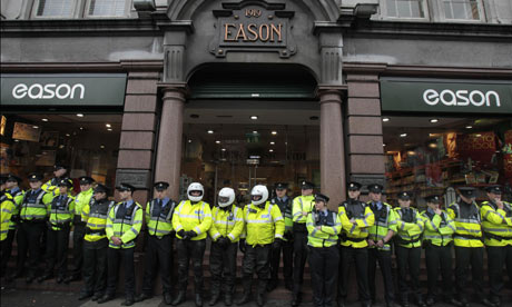 Irish police line the front of Eason's bookstore in Dublin last Saturday for Tony Blair's book signing.