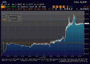 Inflation expectations, as indicated by the yield differential between the 10-Yr Treasury and an equal maturity inflation indexed bond (TIPS), widened 8 bp to 2.14%. (click on chart to enlarge)