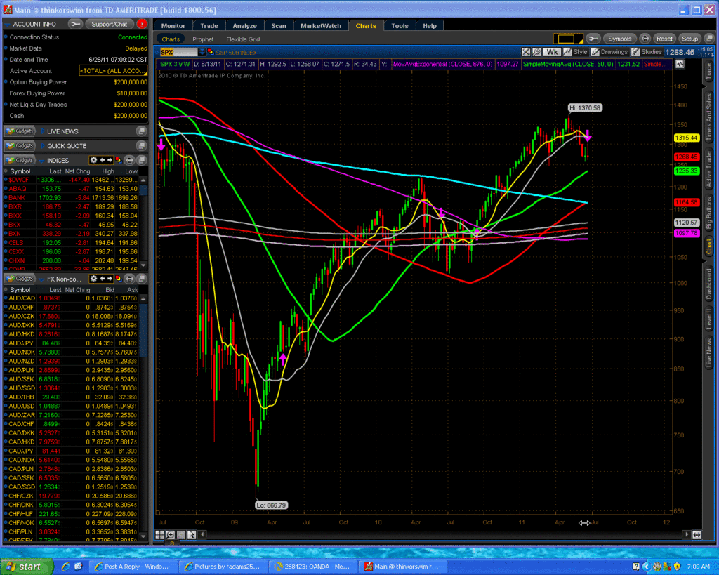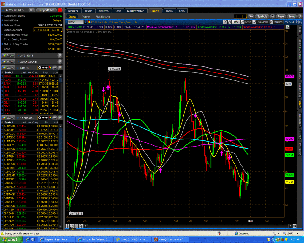 GM git...will post a few weekly charts that seem to paint the same picture and should affirm to some degree our assessment of the USD soon to breakout a bit and S&P to break down for a season.First chart is SPX...it could see a minor bounce attempt but IMO they took it too deep friday after it tested the daiy SMA200...fridays candle needed to be a bullish candle as follow up but instead it was a bearish candle..a marubozu!..its only redeeming aspect was that candle tho bearish was an inside candle which could lend hope for a minor bounce monday before breaking below daily 200 and heading IMO to the weekly 200 around 1160...this chart is a weekly and notice the MA crossover alert arrows(purple)...the indicator alerts on SMA 10/20 crosses and we just had a downward 10/20 cross.If I'm correct there will be a fair amount of downside but not catastrophic.S&P has simply exhausted itself of buyers..IOW its hit top of a trend IMO and now needs correction...the SMA10 and 20 should now form what I call a bowtie like it did before breaking above SMA200...its at this point that it will actually be consolidating and go into a trading rather than trending market.The ultimate outcome cannot be predicted tho as to whether it will advance another leg up or fall hard to search for support..neither should occur tho til consolidation runs its course.Heres the first chart...next one will be on DXY