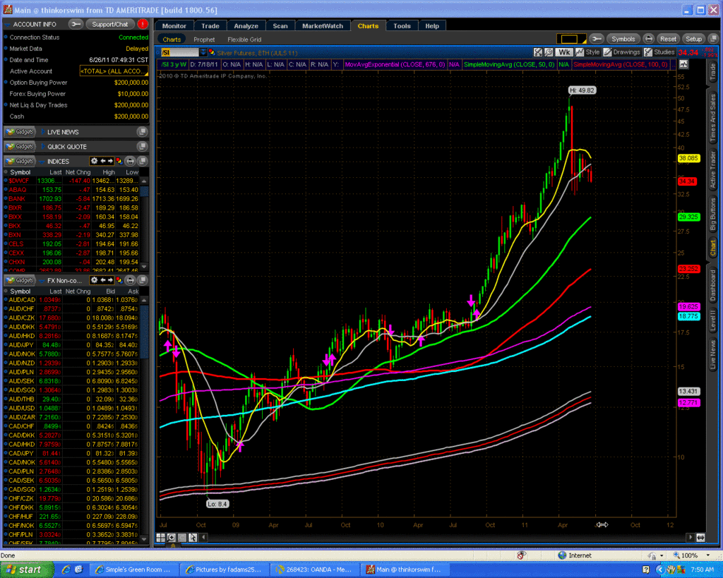 Now for the chart on silver.. weekly chart IMO shows a tired trend like the SPX trend..it appears that the traders have decided that any move above 38 is excessive so selling or shorting has become the game on any rallies now.Its resisting nicely at SMA10 and is now resisting at SMA20...this is normal and it may well do as I expect on SPX for a season and find some crisscross action of SMA10/20 til it forms a bowtie then after that runs its course the natural direction would be a downtrend but again no one can predict til either new trend begins to the downside or old trend continues up.This fits in beautifully with what we see on SPX and DXY due to how the 3 correlate.BTW if silver breaks hard to downside the SMA50 would be target number one at about 29...target 2 about 23 and max downside target about 19...I really dont think we will see it ever breach weekly SMA200 at 18.75...chart