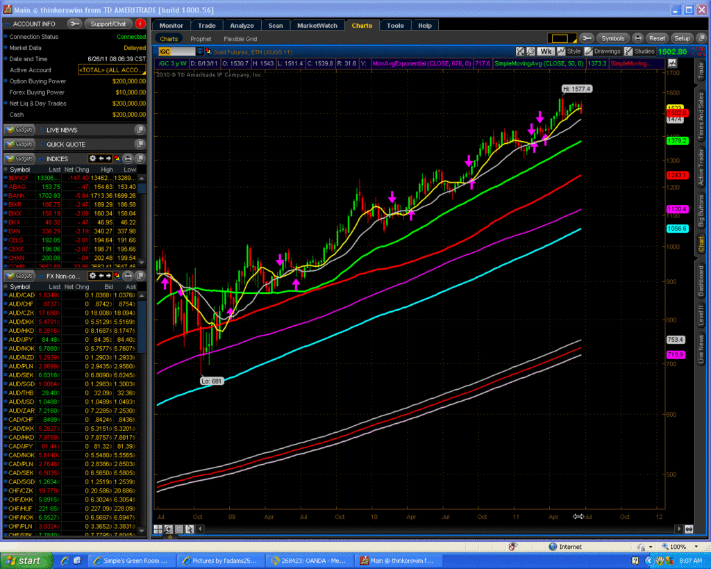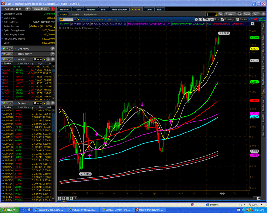 Next chart git..,weekly on gold...I used silver instead on my comparisons charts due to the highly speculative aspect and felt it would track better with the dollar and the equity markets.Gold is a different situation...physical gold is being snapped up across the globe and is moving IMO by true supply/demand rather than speculative trading.The chart on gold shows absolutely no weakness!A dip from where its at now would likely find support around 1450-1475 and launch ever higher with no top in sight.After this chart I may post one more as an afterthought...the Swiss Franc weekly..its also very important
