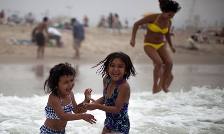 Children cool off in the Pacific ocean during a heat wave in Santa Monica, California. Photograph: Lucy Nicholson/Reuters