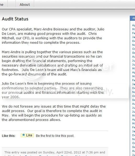 Chris Mitchell 12/03/2012 The other item coming to completion is the long awaited audit, currently being finalized by the Company's auditing firm.